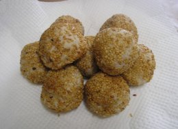 【3】白玉粉で包み外側に白ごま黒ごまを好みでたっぷり付け油を1センチ入れたフライパンで揚げる。