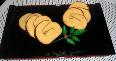 【2】表面が、べたべたしなくなれば、巻きすの上に乗せ、はみ出た部分をカットし、芯にして巻く。巻きすで巻いたまま、両端を輪ゴムで止め、冷ましてから切る。