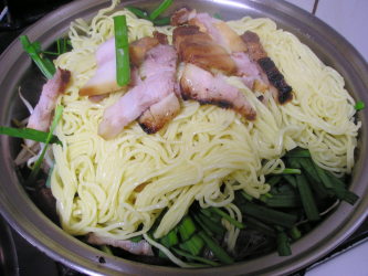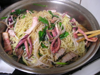※写真は、イカ、野菜(もやし、ニラ、キャベツなど)、麺、焼き豚と順番に乗せて