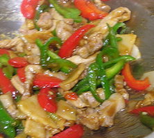 【1】クィーン・ウォックを熱し、肉を入れてフタをする。火が通ったら肉をほぐし、ピーマン、タケノコ、Aを加えフタをする。