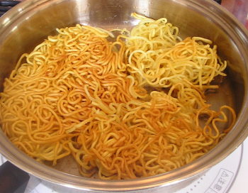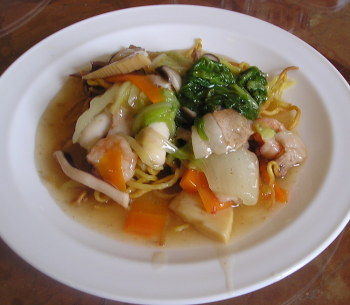 残った油を拭き取り材料を炒め、Aを加えBでとろみをつけ麺にかける。