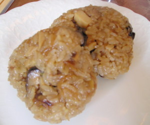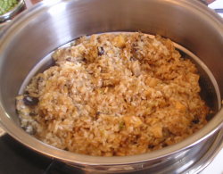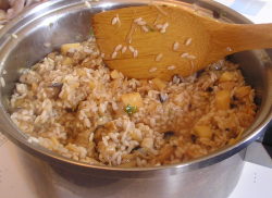 【2】Bに戻し汁と、たして2Cにして【1】に入れ、沸騰したらもち米を入れ、木べらで混ぜながら水分を完全にすわせる。