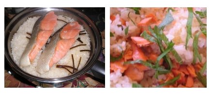 【4】鍋以外で作る人は、鮭は別に焼いて、身をほぐし骨を取っておく。 ごまとか青ジソとか好みで混ぜ合わせ、 最後にのりをかける。 |