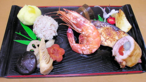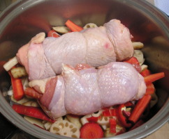 【1】もも肉の厚いところをそいで開き、ごぼうと金時にんじんを巻いて、凧糸で縛るか、ようじで留める。