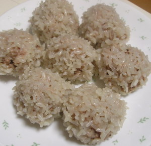 【1】シイタケと豚肉をフードプロセッサー(メタル)でミンチにし、残りの材料を入れてドゥブレードでよく混ぜ、一口大に丸めてもち米を周りにつけ、スチーマーに並べる。