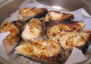【1】大フライパンにクッキングシートを敷いて熱し、ぶりを並べ、中火。約3分。ひっくり返して、2〜3分。A9を入れ照りを付ける。 |