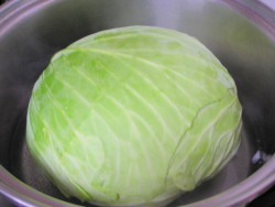 【1】ソースパンに1センチの水を入れ、その中に丸ごと、芯をくり抜いたキャベツを入れ無水で、1枚ずつはがしながらゆでていく。(硬い部分はみじん切り)