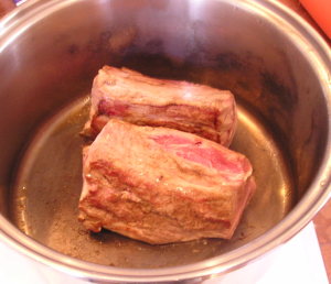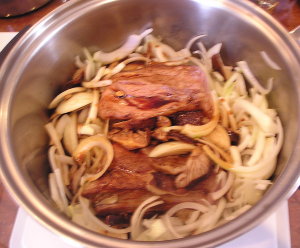 【3】【2】にA:をすべて入れフタが、カタカタなれば、インダクション3にし、30分。途中でひっくり返す。