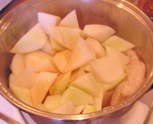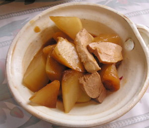 【1】ニンニク生姜唐辛子と大根をいれ調味料も加え煮る。