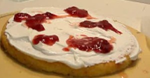 【5】スポンジ1枚目に生クリーム1/3をかけ苺ソー1/3をかけ繰り返す