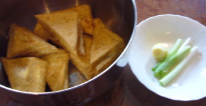 【2】厚揚げに【1】をはさんで5段にし、スティーマーに入れ煮物の上で蒸す。