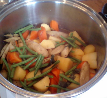じゃがいも、にんじん、ごぼうを入れ軽く炒め、残ったA)のタレと他の調味料を加えフタをし中火でカタカタ鳴ったら蒸気が一筋残るくらいの火加減で野菜に火が通るまで煮る。