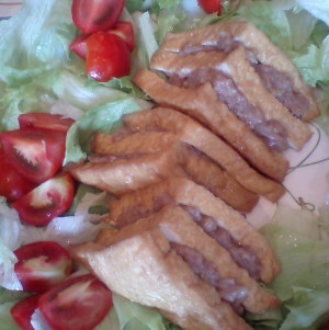 【3】食べやすく切り大皿にレタスをしいてプチトマトなど盛りつける。からし酢醤油でいただく。