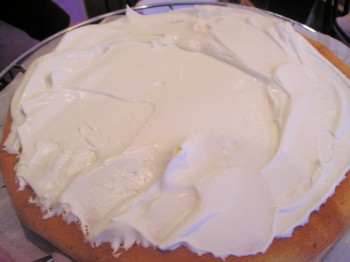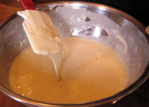 【4】生地をフライパンに流し込みスポンジを焼く(10分から15分程度)できあがったら取りだし冷ましておく。