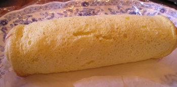 【6】シートの上にスポンジをのせ手前から1/3位までパレットナイフで切り込みを入れ【5】塗って巻き込みサランラップに包んで冷蔵庫で30分ほど寝かせる。端をカットし切り株風にしクリームを塗り飾り付けをする。 |